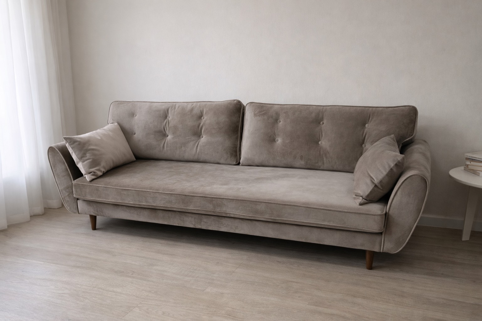 hangliya משלבת בין חמימות סקנדינבית לקווים רטרו-מודרניים מדויקים. עם בד בגוון פחם רך, כפתורים בגב הספה ורגלי עץ טבעי – היא יוצרת מראה חכם, נעים ומעוצב בכל חלל שבו היא נמצאת.